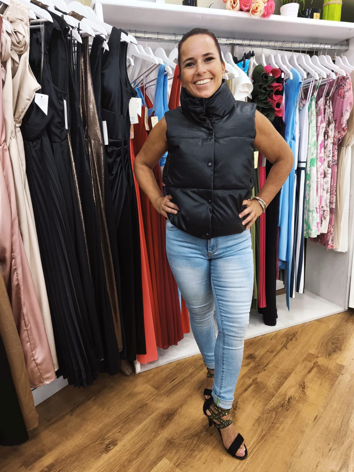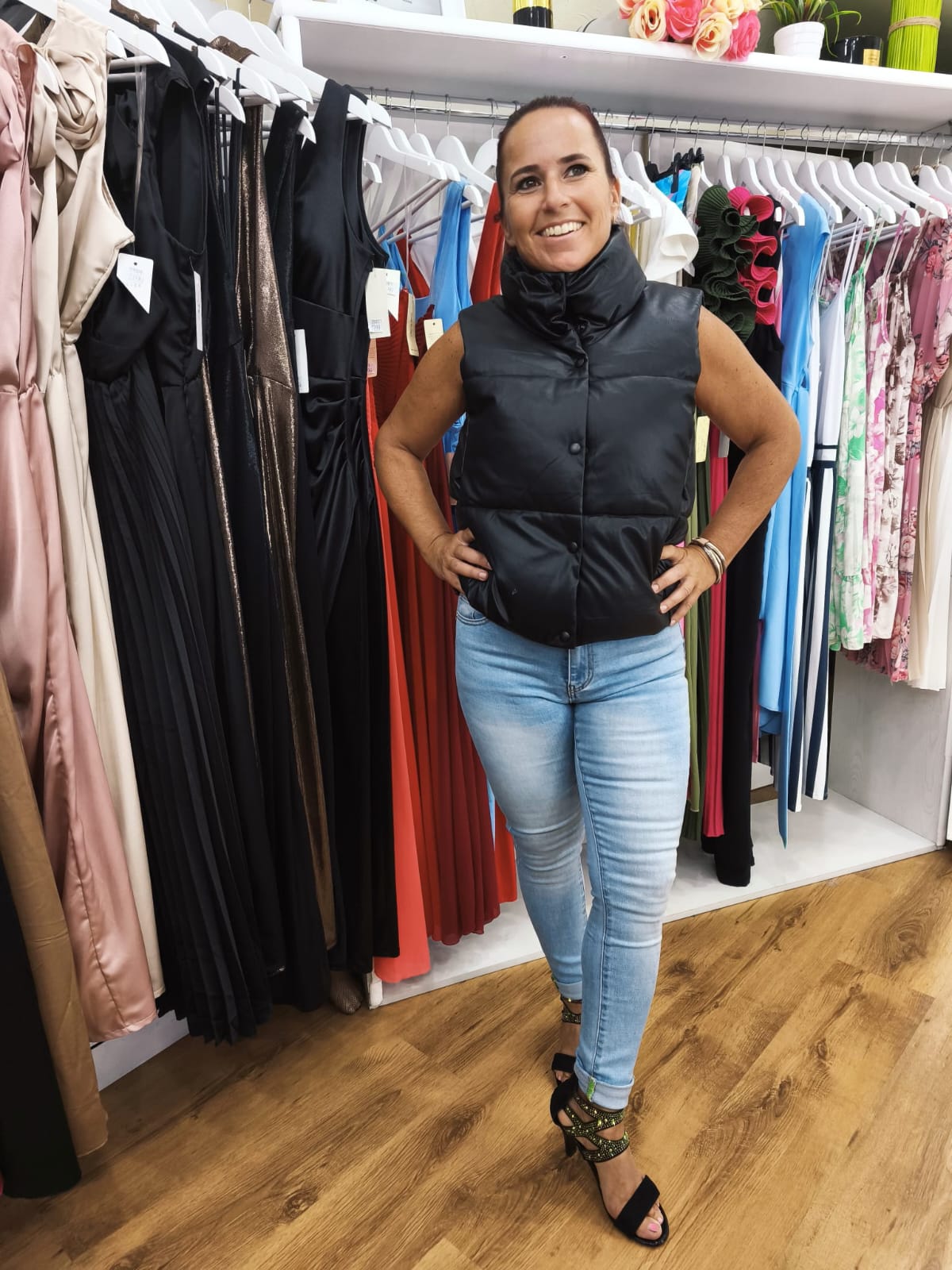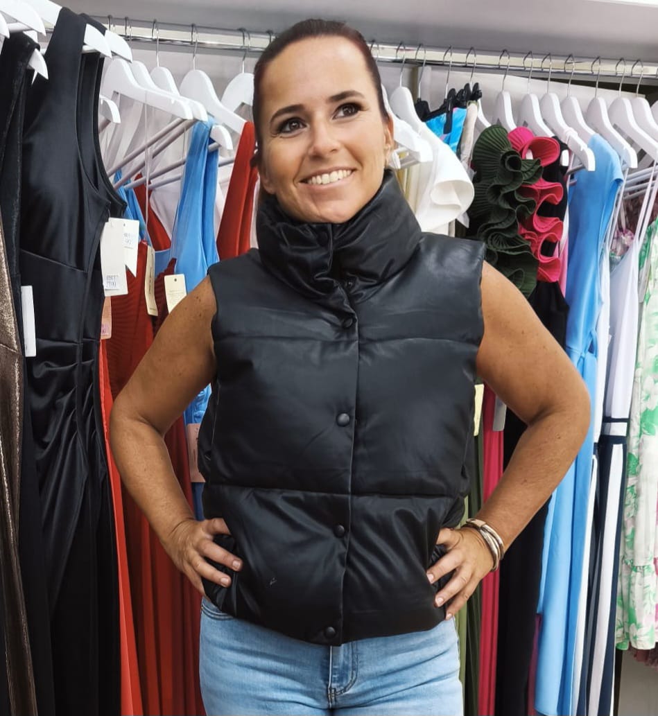 Brezrokavnik Alicia je popolna izbira za jesenske in zimske dni. Na voljo v črni in bež barvi, združuje toploto, udobje in moden videz. Iz lahkega in mehkega materiala, z zapiranjem na gumbe, je vsestranski kos, ki ga lahko kombiniraš z jeansom, puloverjem ali elegantno srajco.